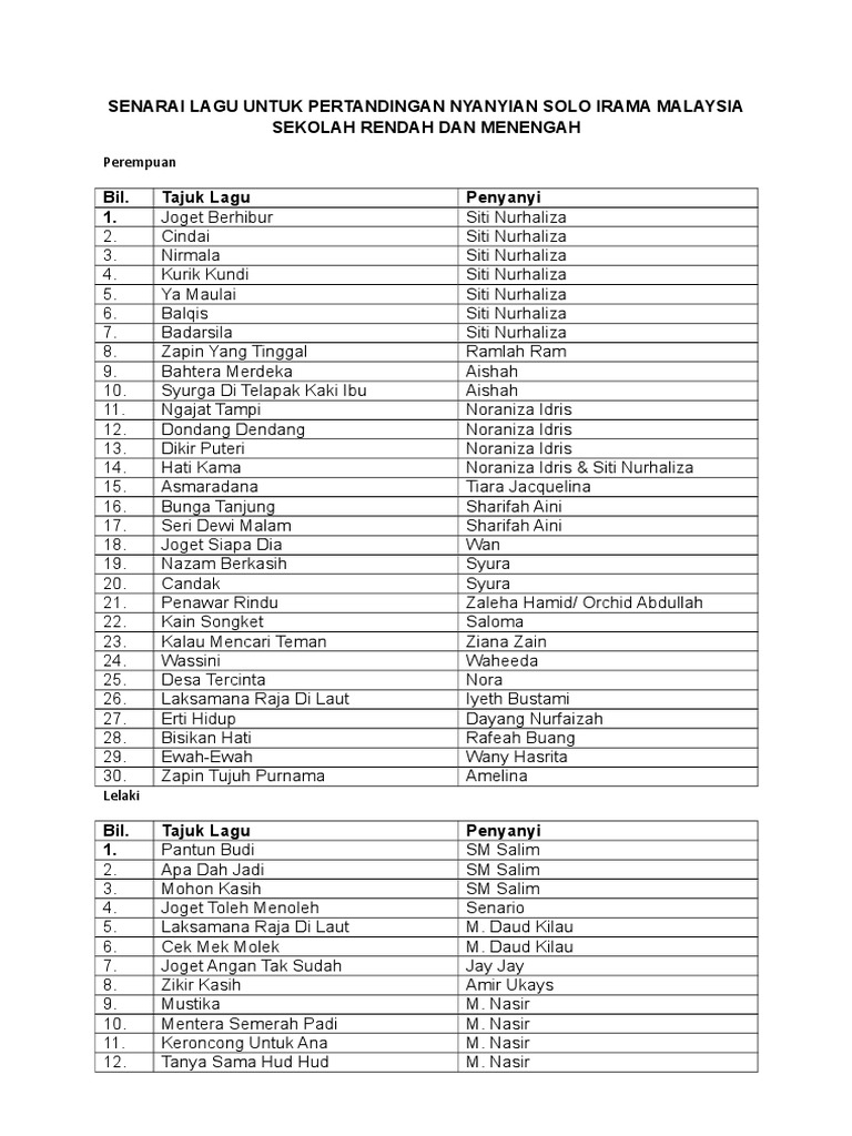 Senarai Lagu Untuk Pertandingan Nyanyian Solo Irama Malaysia Sekolah Rendah Dan Menengah Pdf